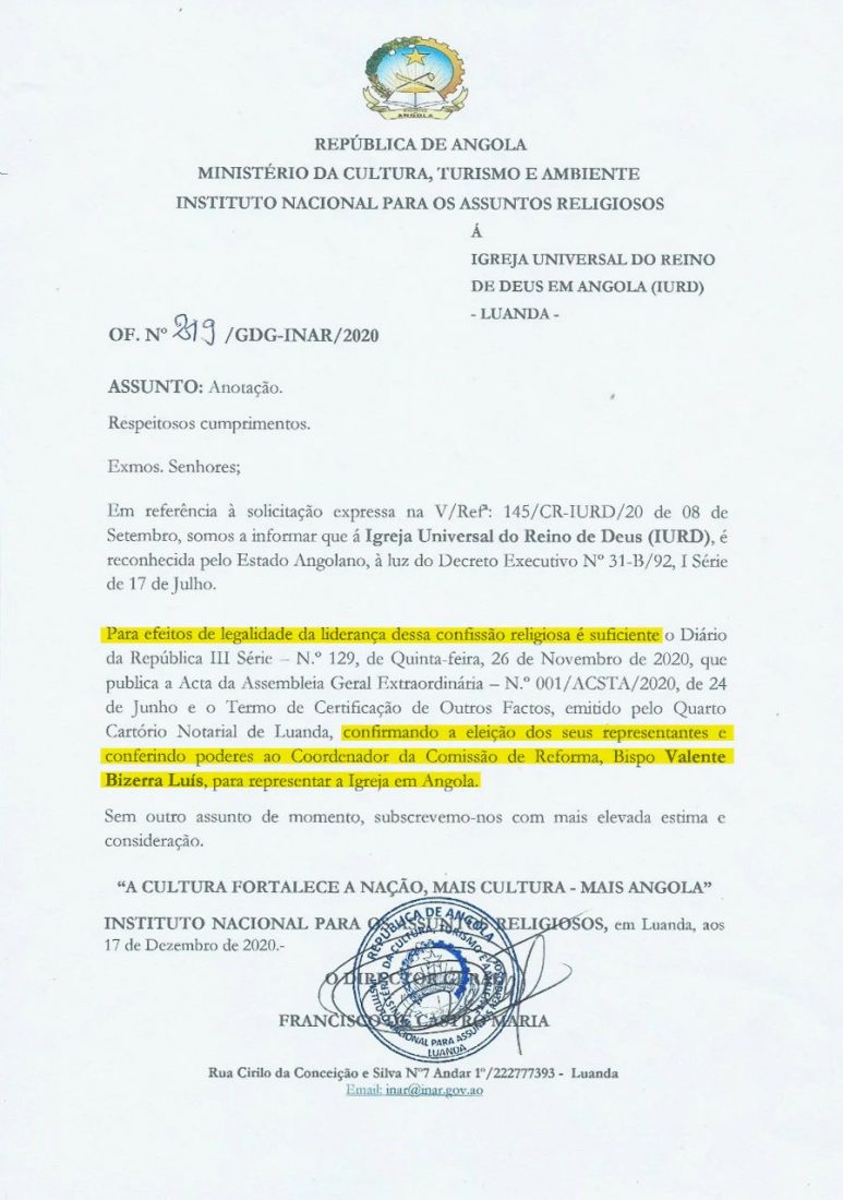 O Instituto Nacional para os Assuntos Religiosos, ligado ao governo do país, certificou o bispo angolano, Valente Bizerra Luís, como representante legal da IURD no País. A decisão ocorre em meio a uma longa rebelião de pastores angolanos contra a instituição. Os religiosos acusam a igreja fundada pelo bispo Edir Macedo de desvio de dinheiro e racismo.