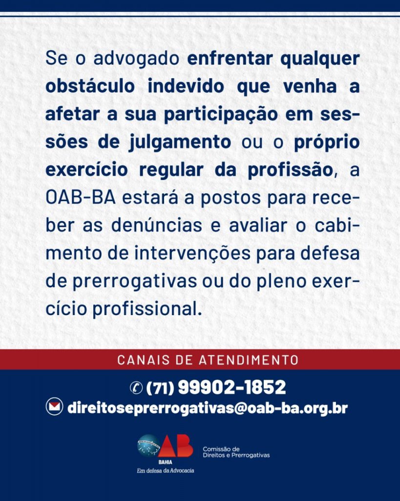 Apesar da suspensão das atividades presenciais, a Ordem dos Advogados do Brasil - Seção Bahia vem divulgando canais de atendimento para os advogados caso queiram realizar reclamações caso as prerrogativas da profissão não sejam respeitadas.