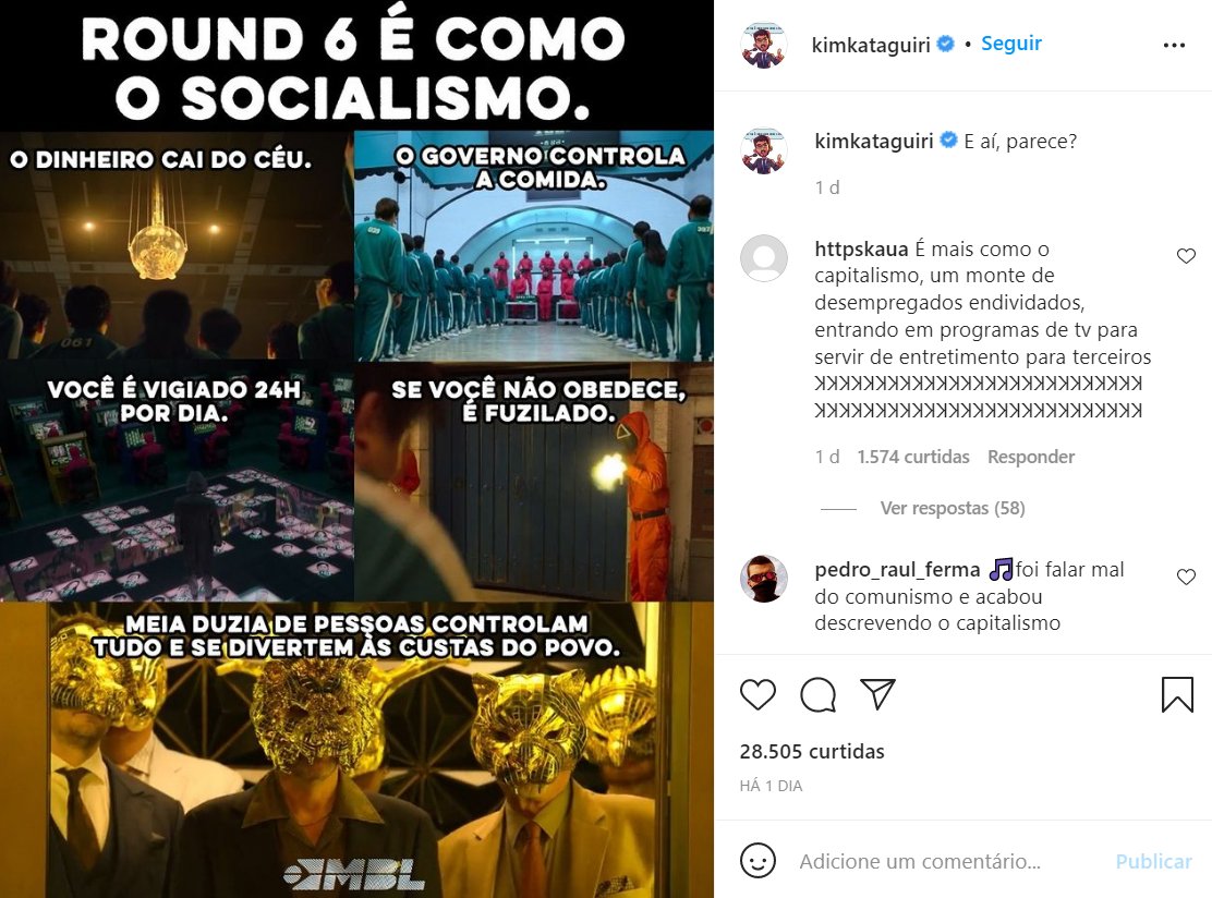"É mais como o capitalismo, um monte de desempregados endividados, entrando em programas de TV para servir de entretenimento para terceiros", rebateu mais um. “Foi falar mal do comunismo e acabou descrevendo o capitalismo”, disse outro. “Nossa, pensei que estava descrevendo o capitalismo. Riqueza concentrada em poucas pessoas. Povo comprando osso. Querem Estado mínimo, porém quando há uma crise o capital corre e deixa a massa na M”, comentou um terceiro. “A série é literalmente uma crítica ao Capitalismo e você tá aí falando merda”, afirmou outro seguidor.