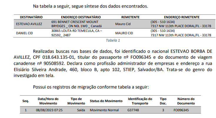 O endereço do empresário, que mora no Canadá, aparece ainda como destinatário de uma encomenda enviada da Flórida (EUA). Estevão Borba de Avillez chegou, inclusive, a visitar Mauro Cid na prisão em 2023. Informações do BNEWS em 25/07/2024